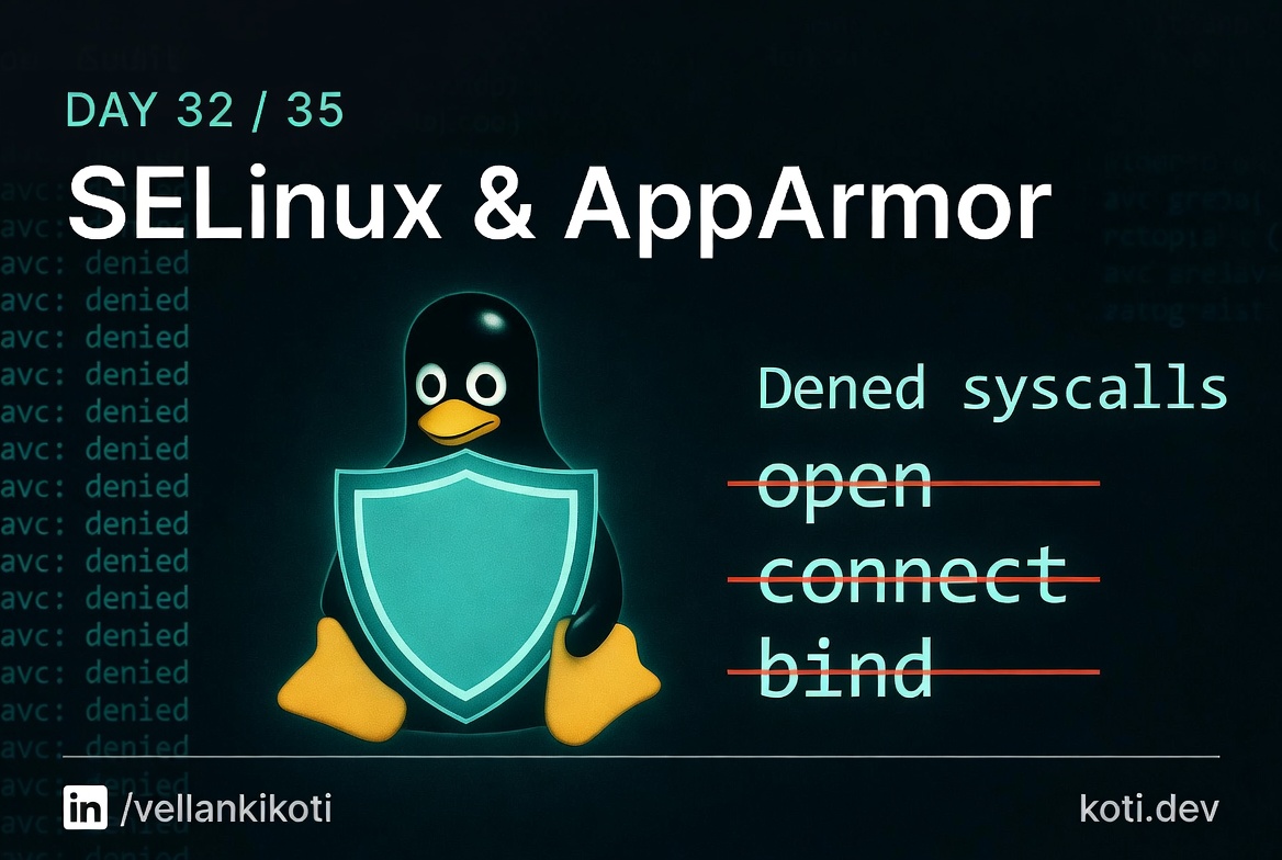 SELinux and AppArmor are Linux Security Modules that sit below the regular Unix permission model. Even if DAC says "this UID can read this file," the LSM gets a second vote and can refuse. In Kubernetes land, this matters because the container runtime labels your container with an SELinux context, and the files on the node (hostPath, emptyDir, local PVs) have their own context. If they do not match, the kernel refuses the syscall and there is no error anywhere that Kubernetes-level tooling will show you.